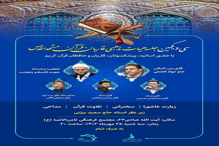 به گزارش ایکنا از خراسان رضوی، سیویکمین جلسه هیئت مذهبی قاریان قرآن مشهد با حضور قاریان برجسته، اساتید و پیشکسوتان قرآنی برگزار خواهد شد.